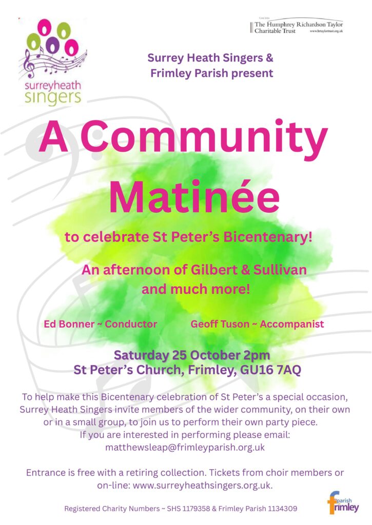 Rehearsal evenings are entertaining, enriching and enjoyable and a warm welcome is extended to all who come along. We rehearse each Monday evening (except on some Bank Holidays) from 7:30pm – 9:30pm in St Peter’s Church, Frimley, Surrey, GU16 7AQ.